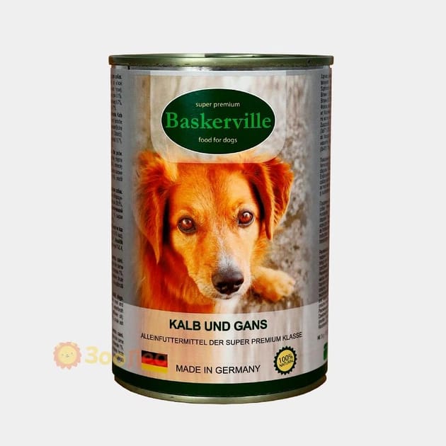 Baskerville — преміальний вологий корм для собак з натуральною телятиною та м’ясом гуски. Ідеально підходить для дорослих собак усіх порід, забезпечує повноцінне харчування, здорове травлення та блискучу шерсть. Високий вміст м’яса, без штучних барвників та консервантів.