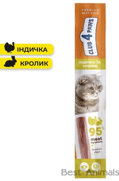 CLUB 4 PAWS М’ясна паличка Преміум: Індичка з кроликом — преміальні ласощі для котів