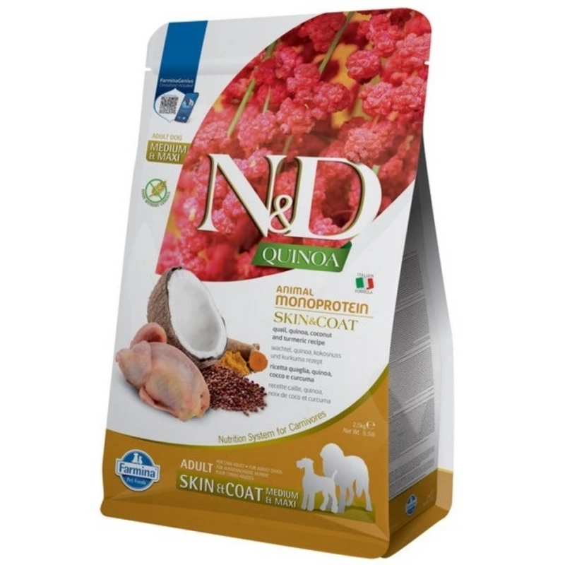 FARMINA N&D QUINOA SKIN&COAT створений спеціально для собак з чутливою шкірою та схильністю до алергічних реакцій. Формула корму базується на гіпоалергенному м’ясі перепелів — рідкісному джерелі білка, який рідко викликає непереносимість.