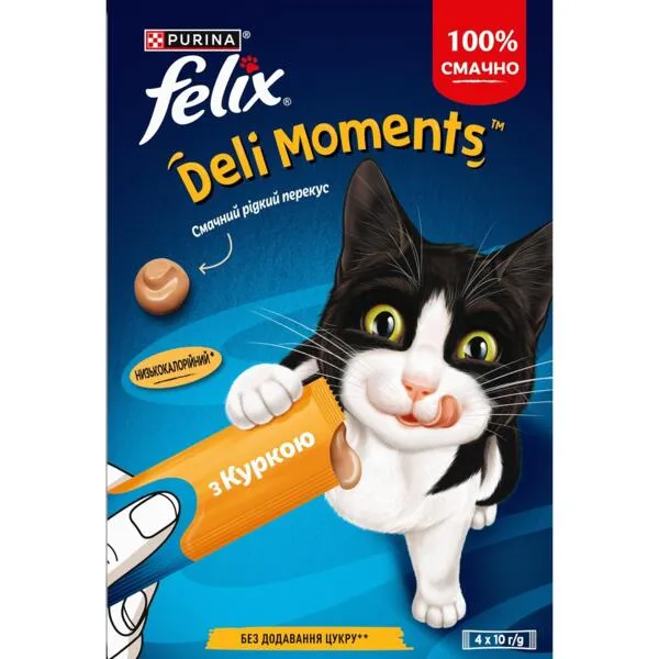 FELIX DeliMoments (ФЕЛІКС Смачні Моменти) — це преміальне лакомство для котів від світового бренду FELIX, яке перетворює звичайні моменти на особливі. Рідкий снек з куркою створений спеціально для того, щоб підкреслити вашу любов до улюбленця та подарувати йому справжнє задоволення від смаку. Кожна упаковка містить 4 стіки по 10 грам, що забезпечує оптимальну порцію для одноразового споживання.