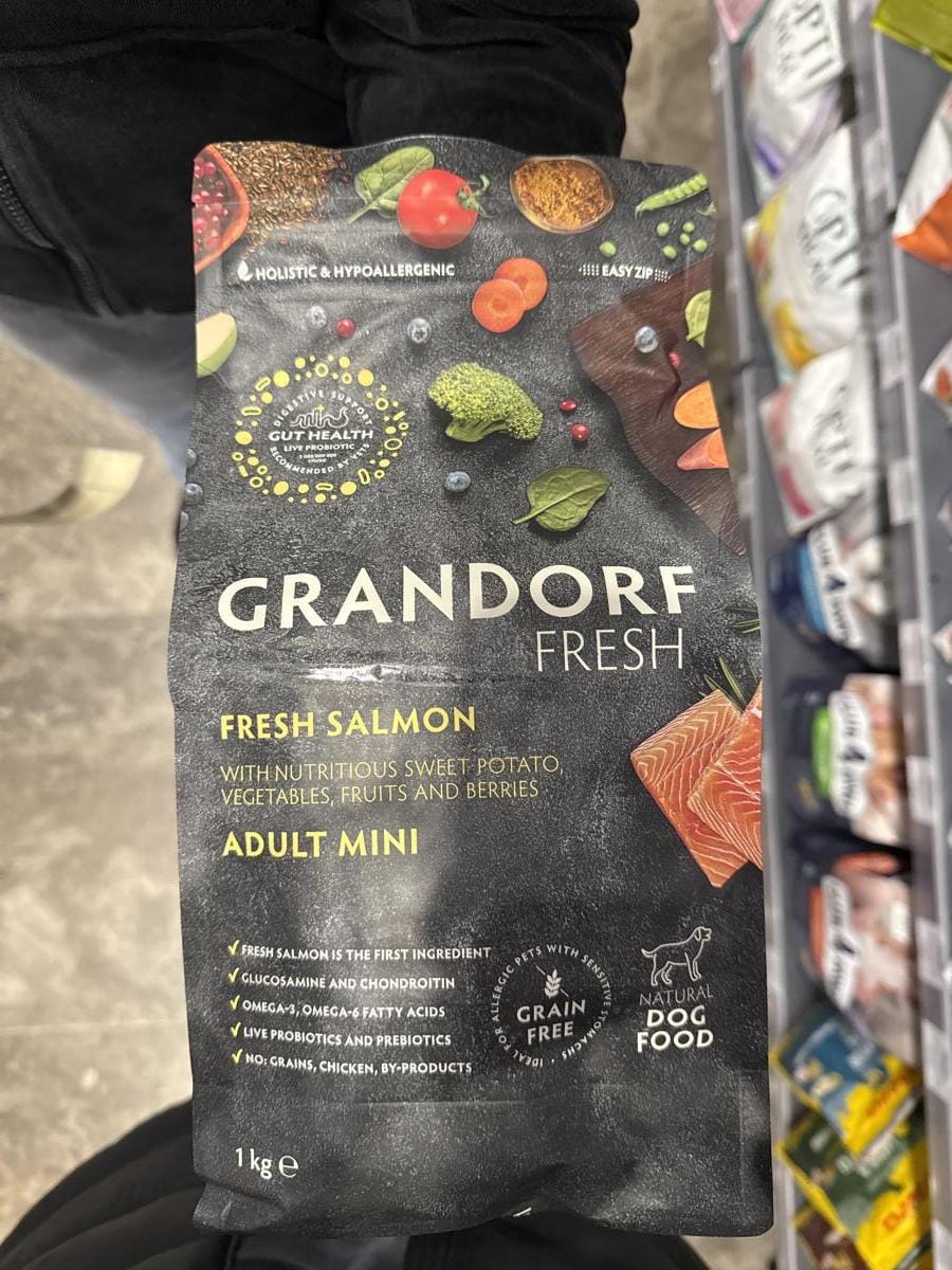 GRANDORF Fresh Adult Dog Mini Salmon & Sweet Potato — преміальний беззерновий корм з свіжим лососем та бататом для дорослих собак малих порід. Гіпоалергенна формула з пробіотиками забезпечує здорове травлення, блискучу шерсть та міцний імунітет. Ідеально підходить для активних собак вагою до 10 кг.