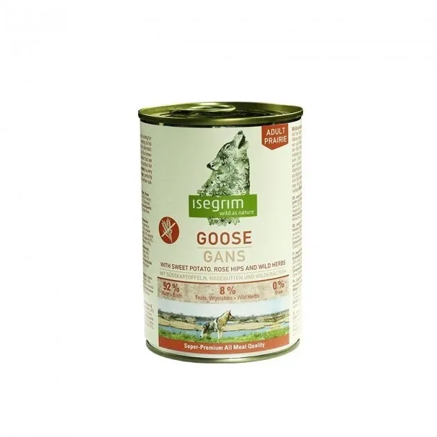 ISEGRIM Goose with Sweet Potato — це преміальний німецький вологий корм для собак усіх порід та віку, створений за принципами природного харчування м’ясоїдних тварин. Бренд ISEGRIM відомий своїм унікальним підходом до виробництва кормів: використовуються виключно натуральні інгредієнти, що зустрічаються в дикій природі. ISEGRIM Goose містить 95% м’яса гуски та субпродуктів, доповнених корисними овочами і травами, що робить цей корм ідеальним вибором для власників, які дбають про здоров’я своїх вихованців.