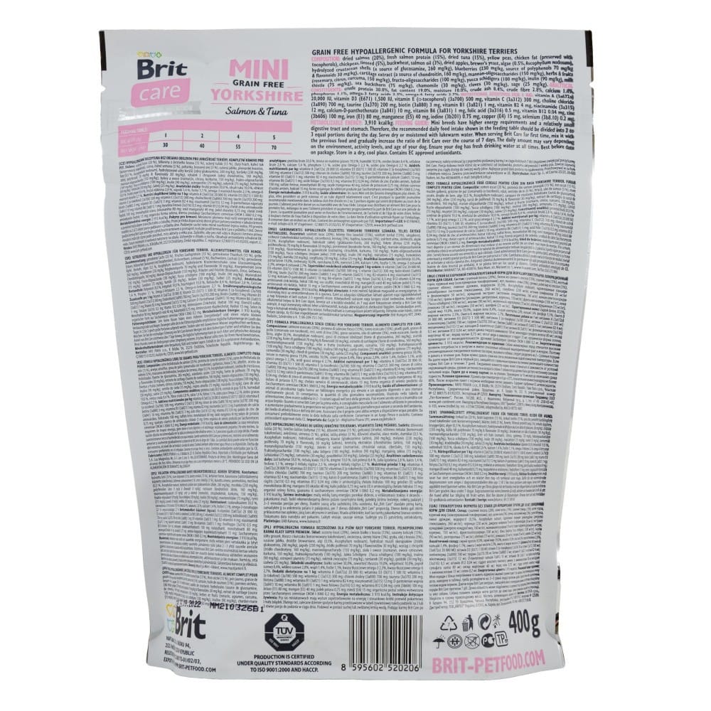 Йоркширські тер’єри — це особлива порода з унікальними потребами. Їхня розкішна шовковиста шерсть потребує спеціального харчування, а маленький розмір вимагає високої енергетичної цінності корму. Brit Care Grain-Free Mini Yorkshire розроблений з урахуванням чутливої травної системи йорків, схильності до алергічних реакцій та потреби у підтримці здоров’я шкіри і шерсті. Беззернова формула робить цей корм ідеальним вибором для собак з чутливим травленням або непереносимістю глютену.