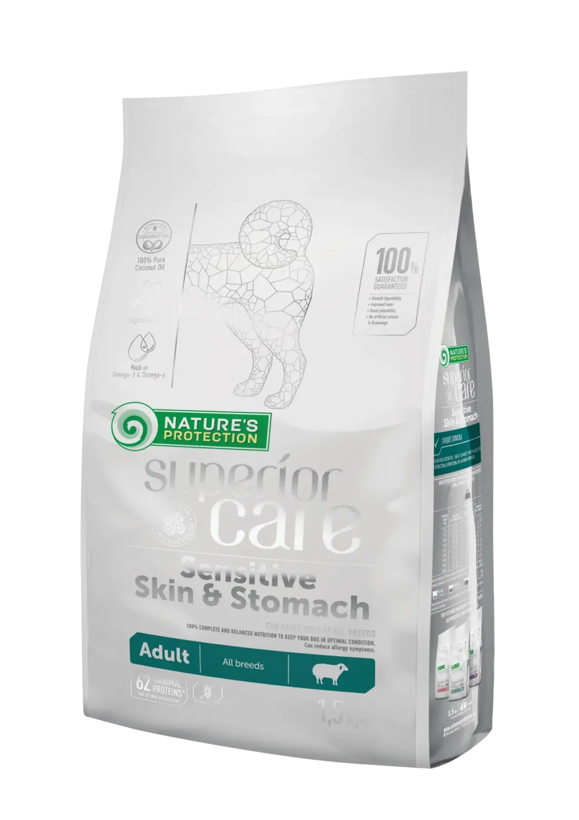 Корм Nature’s Protection Superior Care Sensitive Skin & Stomach створений з урахуванням потреб собак, схильних до харчової непереносимості та шкірних проблем. Формула містить селекційно відібрані інгредієнти, які мінімізують ризик алергічних реакцій та подразнень. Корм підходить для дорослих собак усіх порід – від мініатюрних йорків до великих німецьких вівчарок.