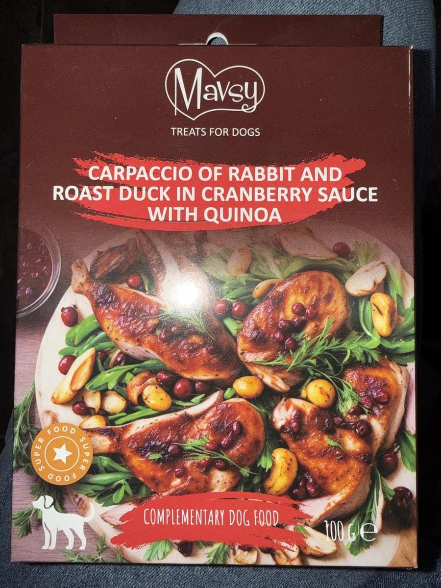 MAVSY Карпачо з крольчатини та запеченої качки в журавлиновому соусі з кіноа — це унікальні преміальні ласощі для собак, створені за європейськими стандартами якості. Бренд MAVSY спеціалізується на виробництві натуральних смаколиків з відбірних інгредієнтів, які поєднують вишуканий смак та максимальну користь для здоров’я вашого чотирилапого друга. Ці делікатесні м’ясні смужки підходять для собак усіх порід, розмірів і вікових категорій.
