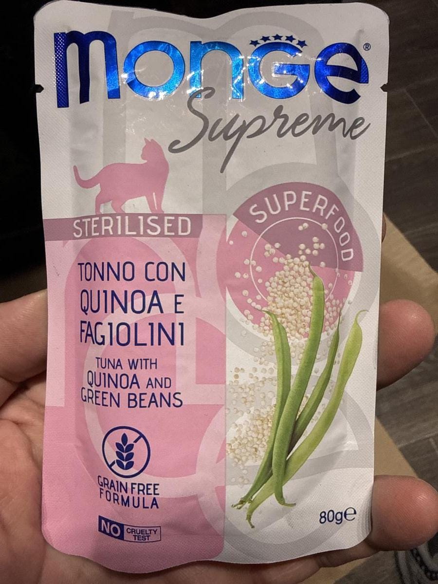 MONGE CAT WET STERILISED з тунцем, кіноа та стручковою квасолею — преміальний вологий корм для стерилізованих котів та кішок. Збалансована формула підтримує оптимальну вагу, здоров’я сечовидільної системи та забезпечує вашого улюбленця усіма необхідними поживними речовинами. Порція 80 г ідеально підходить для щоденного годування.