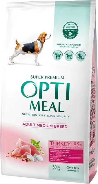 Замовте OPTIMEAL сухий корм для собак середніх порід з індичкою 1,5 кг з безкоштовною доставкою по Україні! Подаруйте своєму улюбленцю якісне та збалансоване харчування за доступною ціною.