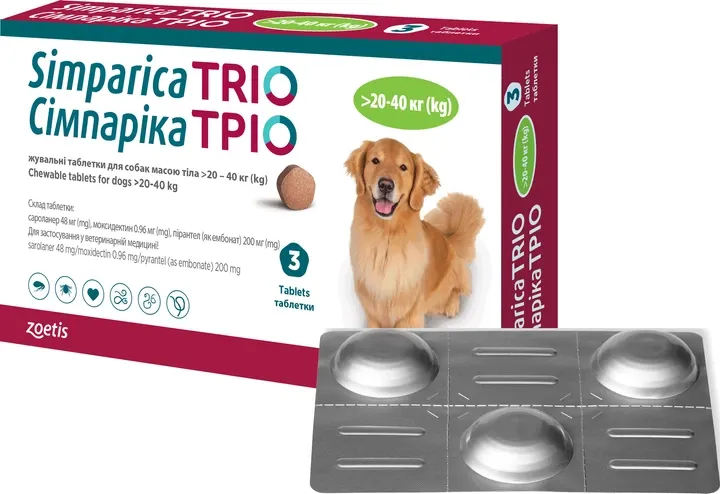 Жувальні таблетки Сімпаріка ТРІО розроблені спеціально для собак середніх та великих порід вагою від 20 до 40 кг. Цей препарат ідеально підходить для активних собак, які багато часу проводять на вулиці, у парках, лісах або на природі, де ризик зараження паразитами особливо високий. Завдяки унікальній комбінації сароланеру, моксидектину та піропроксифену, Сімпаріка ТРІО забезпечує тройну дію проти паразитів.