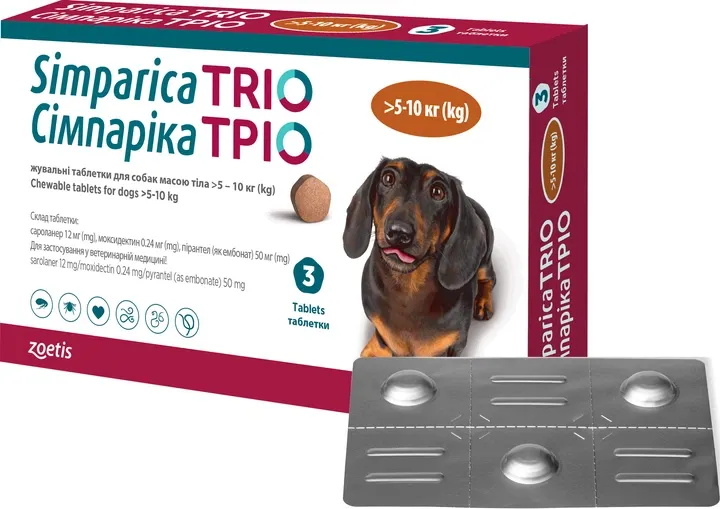 Сімпаріка ТРІО — жувальні таблетки для собак 5-10 кг, 3 шт