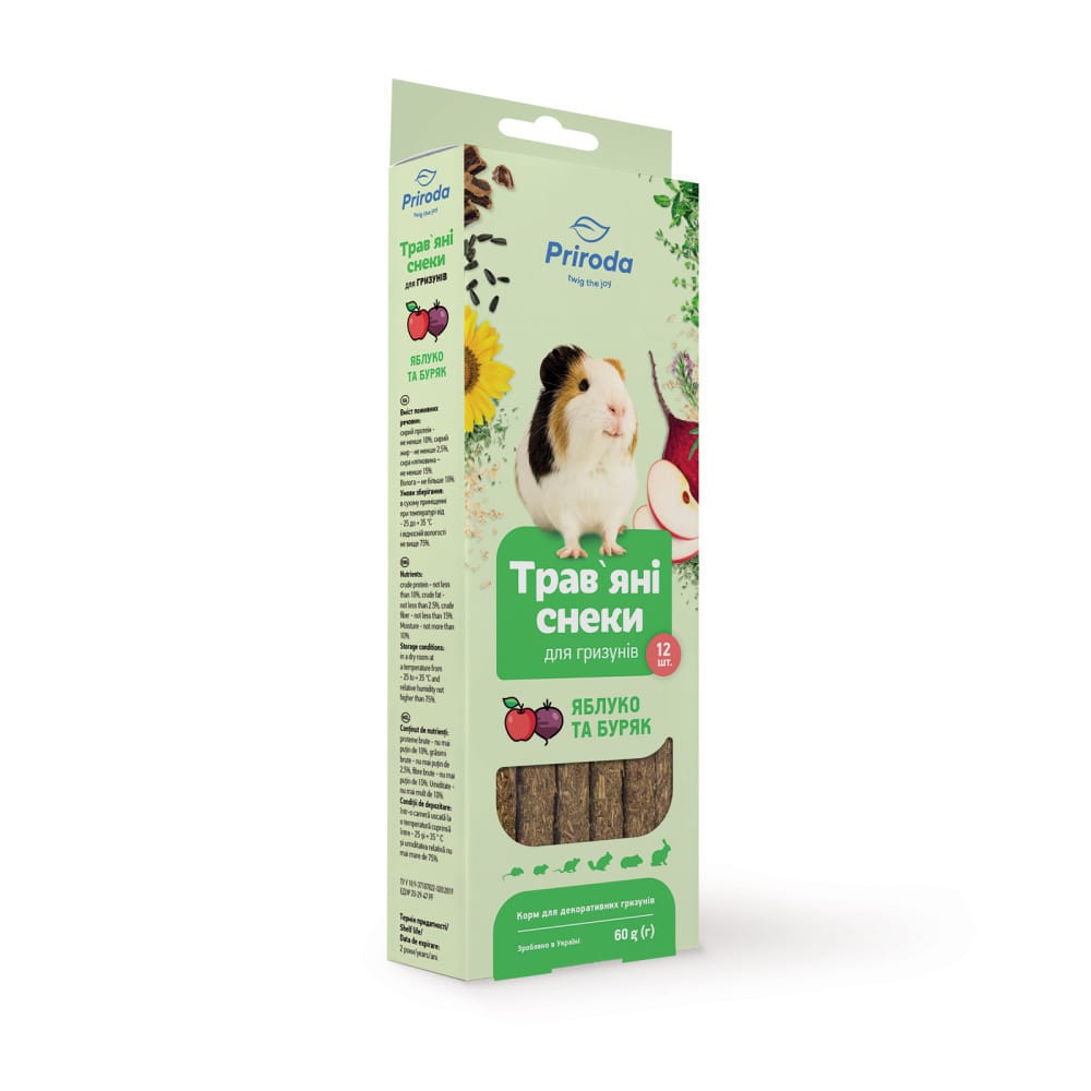 Природа Трав’яні снеки Яблуко та Буряк — це преміальні натуральні ласощі, розроблені спеціально для гризунів. Бренд “Природа” вже багато років є синонімом якості в сегменті зоотоварів в Україні. Трав’яні снеки виготовлені з ретельно відібраних інгредієнтів без штучних барвників, консервантів та ароматизаторів. Ці ласощі ідеально підходять для кроликів, морських свинок, шиншил, хом’яків, дегу та інших декоративних гризунів, забезпечуючи їх організм необхідними поживними речовинами та вітамінами.