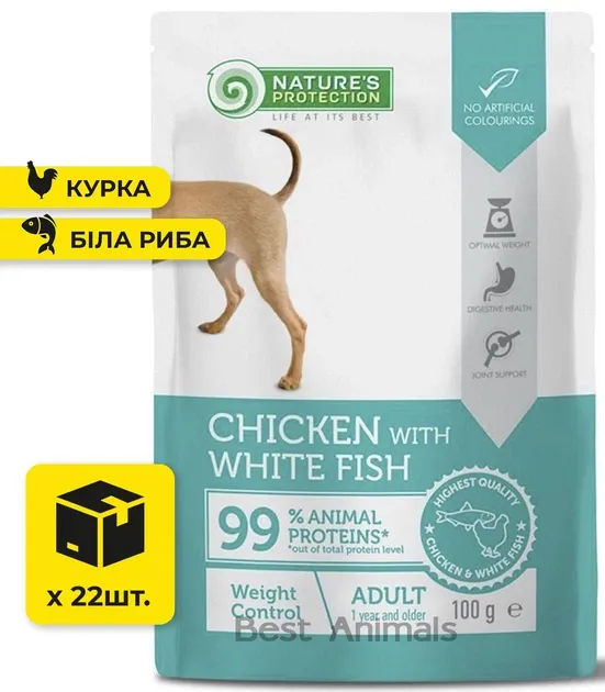 Формула з куркою та білою рибою забезпечує відмінні смакові якості, тому навіть найвибагливіші песики з задоволенням споживають цей вологий корм для контролю ваги.
