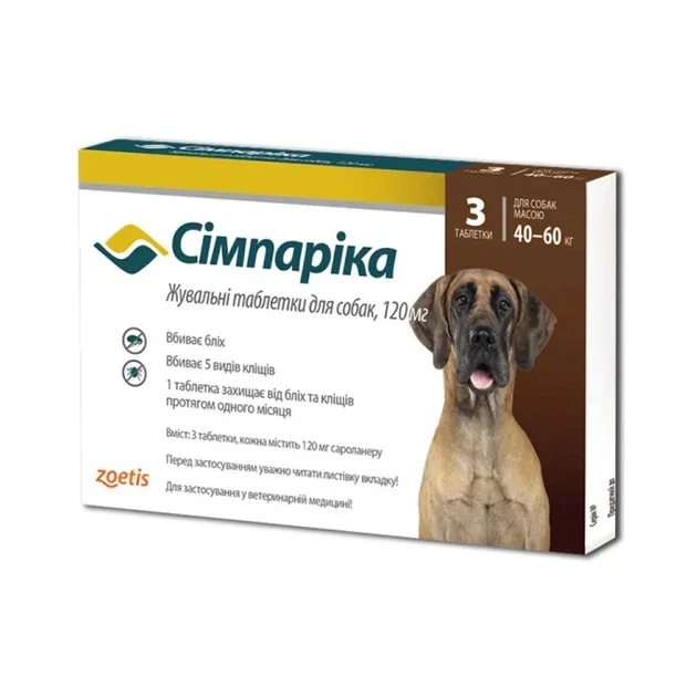 Дозування: Для собак вагою 40-60 кг використовуйте одну таблетку Сімпаріка 120 мг. Якщо вага вашої собаки відрізняється, оберіть відповідне дозування препарату.