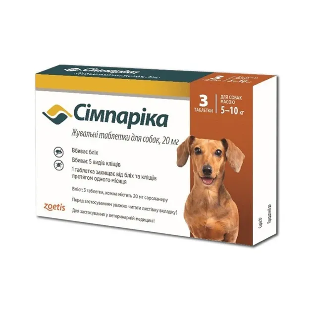 Сімпаріка 20 мг — ефективні жувальні таблетки для захисту собак вагою 5-10 кг від бліх, іксодових кліщів та саркоптозу. Діють протягом 35 днів після одноразового застосування. У упаковці 3 таблетки з приємним смаком для зручного прийому.